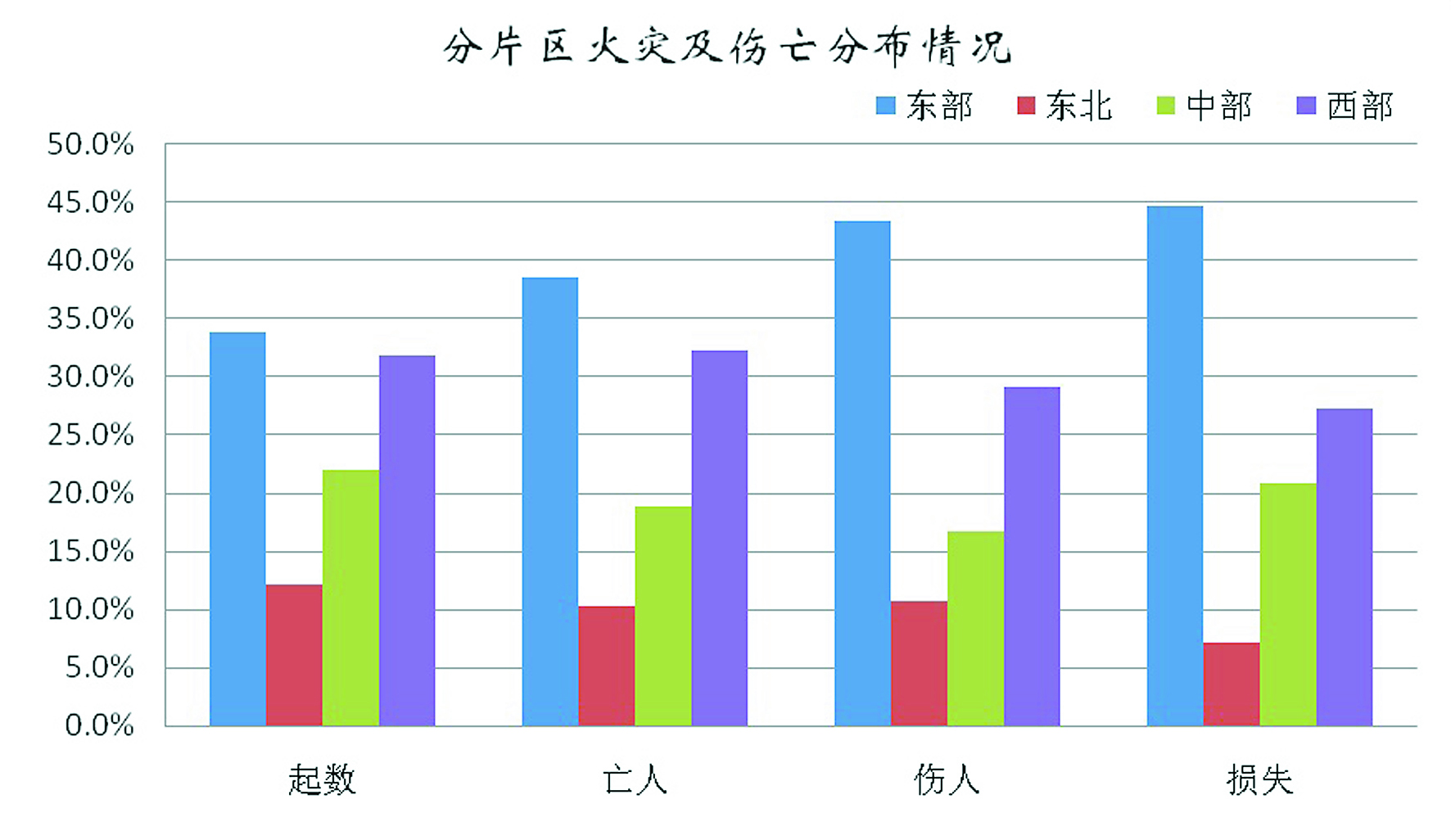 東部地區經濟總量大、人口密集,火災荷載大、風險高,東部10個省(直轄市),即京、津、冀、滬、蘇、浙、魯、閩、粵、瓊共發生火災8萬起,造成543人死亡、347人受傷、直接財產損失達15.1億元,分別占總數的33.9%、38.6%、43.5%和41.5%。
