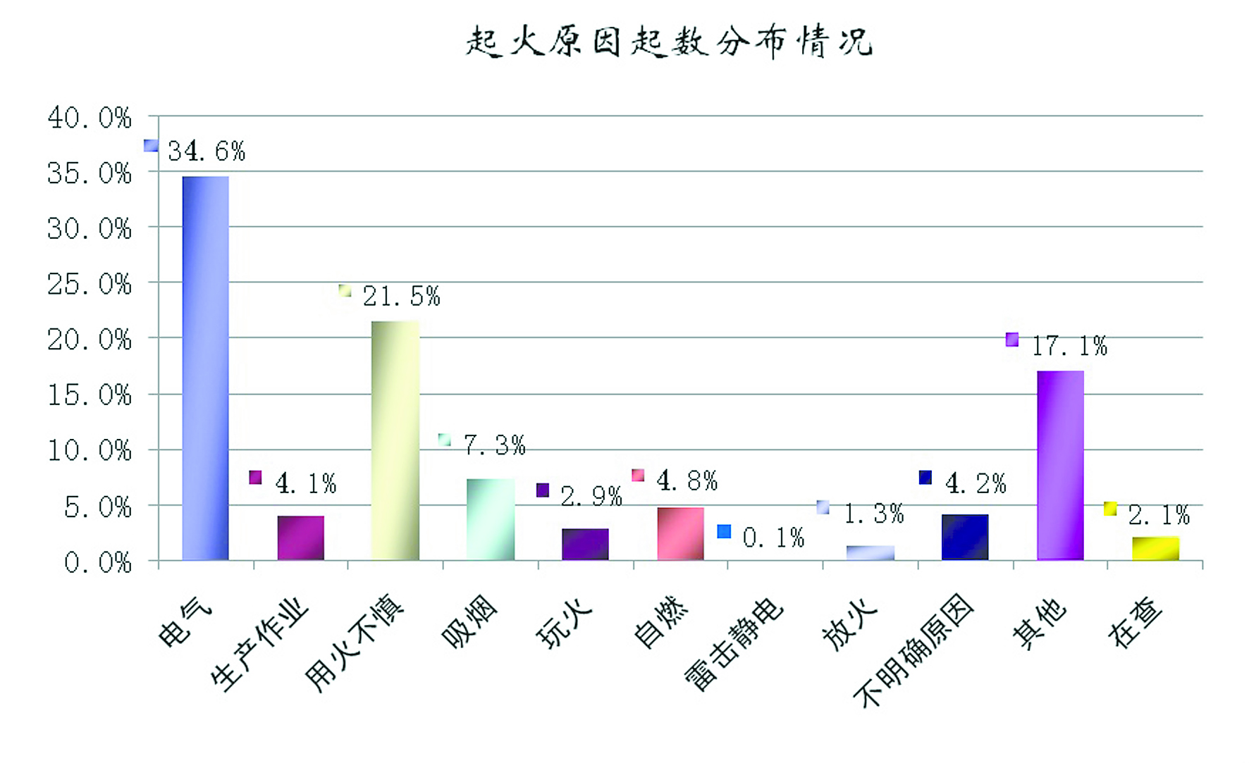 因違反電氣安裝使用規定引發的火災起數占全年火災起數的34.6%。生活中因用火不慎引發的火災占全年火災起數的21.5%。吸煙引發的火災占全年火災起數的7.3%。自燃引發的火災占全年火災起數的4.8%。生產作業不慎引發的火災占全年火災起數的4.1%。玩火引發的火災占全年火災起數的2.9%。放火引發的火災占全年火災起數的1.3%。雷擊靜電引發的火災占全年火災起數的0.1%。其他原因引發的火災占全年火災起數的17.1%。原因不明確引發的火災占全年火災起數的4.2%。起火原因仍在調查的火災占全年火災起數的2.1%。